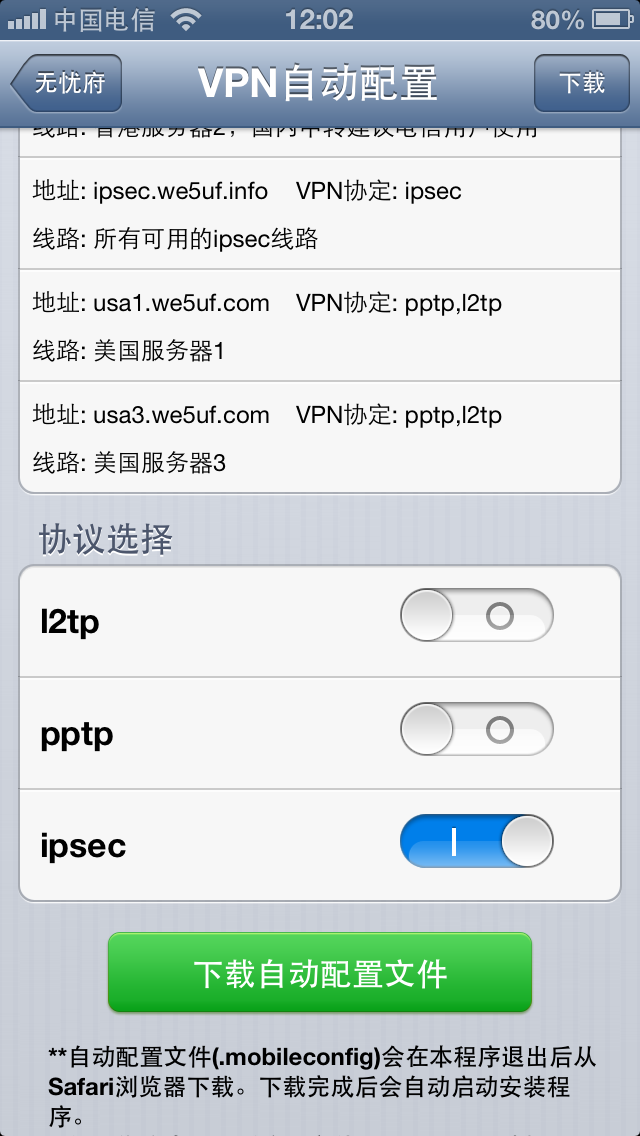 IOS(iPhone,iPad,iTouch): 无忧府APP->下载配置文件->OpenVPN->手工配置 安卓用户: 手工配置->openvpn->strongswan(iKev2)->sstp