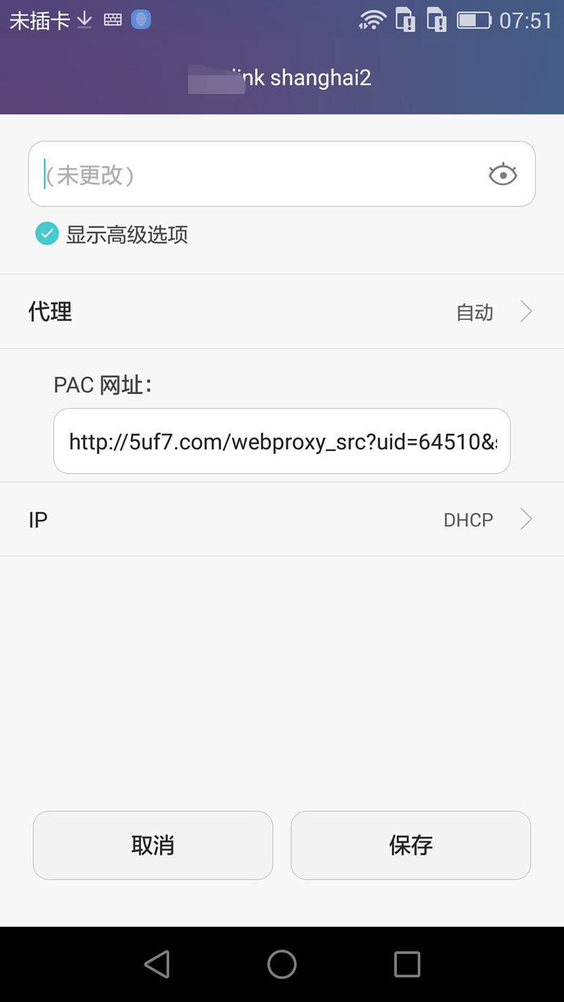 3.添加到系统设置-无线网络(wifi) 找到你的热点名称,显示高级选项,找到最下面的自动代理,粘上这个地址.