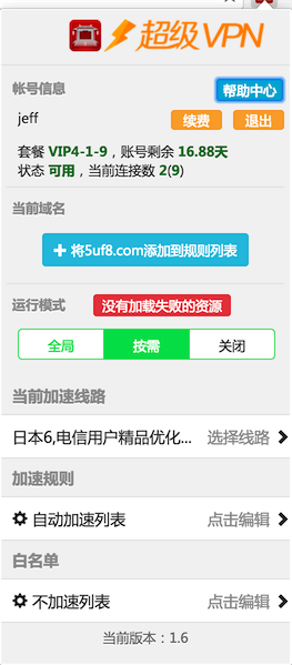 1.6版 优化了域名匹配的算法,更多准确和智能来识别三级域名,如google.co.jp,域名匹配更准确,如g.co会匹配 gg.com这样的问题.优化用户只有一个连接数的情况下,切换出现超过连接数的问题. 显示界面少量更新,直接在下拉那里显示版本号,建议所有用户更新.