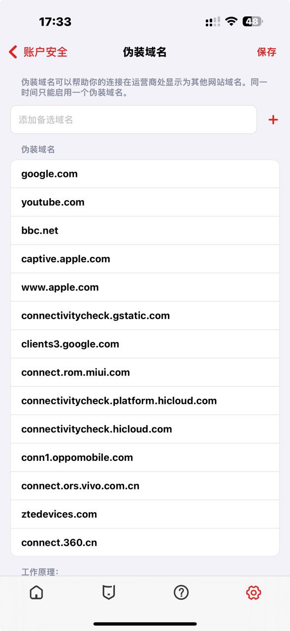 Recommended spoof domains include popular sites like baidu.com, bing.com, and apple.com